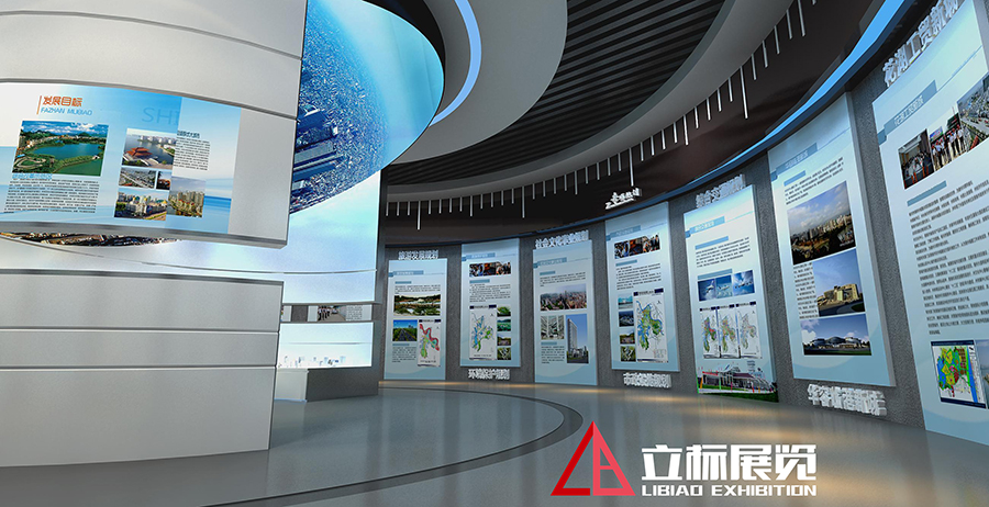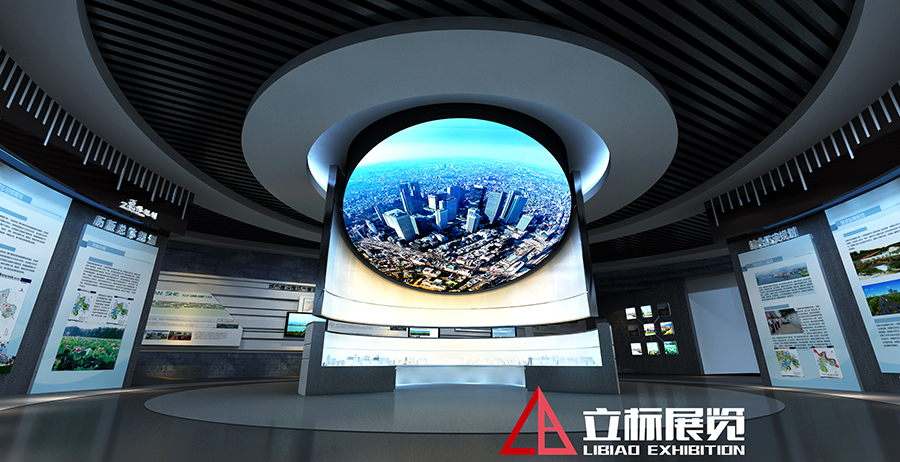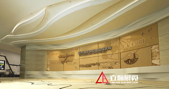 序廳設計簡潔高雅而不失恢宏大氣,天花以婉轉流美的曲線勾勒出奔騰的長江意象,與地板上的寫意地圖上下呼應,讓觀眾在俯仰之間感受鄂州通江達海的優勢區位和襟江帶湖的水韻氣質。迎面的主題形象墻上,連綿的曲線猶如長江之波,溫潤著這座秀美的城市。波浪之上,厚重的浮雕鋪展開以“五個鄂州”為主題的壯美畫卷,山水掩映間,一座宜居宜業的組群式大城市正呼之欲出。